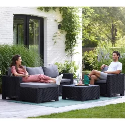 The California 4 seater chaise lounge set is made of more than 83% recycled resin with a 6mm round wicker design. The woven wicker style creates a luxurious and trendy look and can create a focal point in any outdoor space. The set consists of a three seater sofa and x1 armchair with wide deep seating , a table and square foot stool with cushion which is perfect for putting your feet up and relaxing or as an extra seating option when hosting indoors in your conservatory, or outdoors on gardens and patio areas. The cushions included are 7.5 cm thick and provide optimal seating comfort to relax and unwind. Lightweight in its structure therefore is easier to move to suit any setting and is easy and quick to assemble. The garden set is completely maintenance-free and weather-resistant, so you can enjoy the lounge set for years to come.