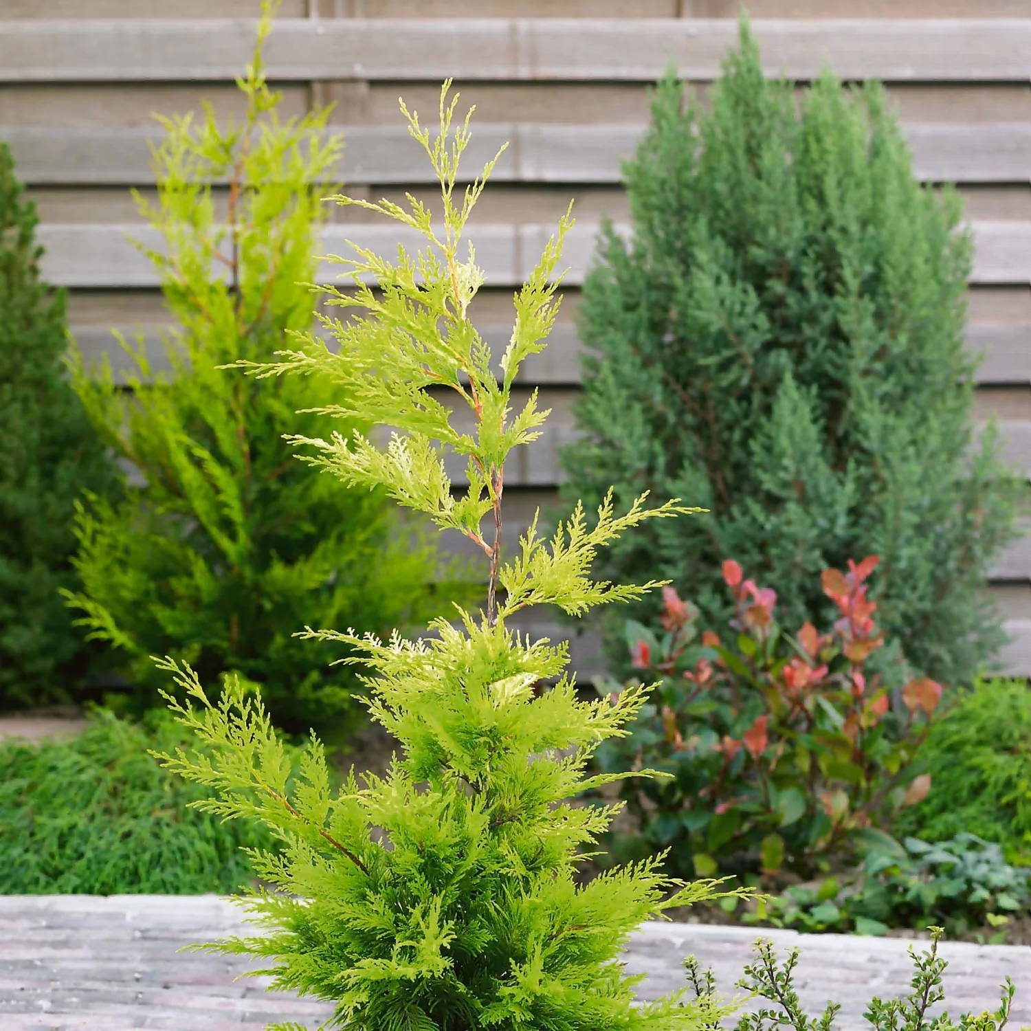 A really unusual choice to add impact to borders and containers. The lime-green, evergreen foliage turns yellow-gold at the tips and cones are borne in Spring.
